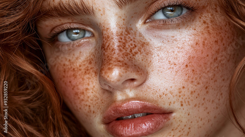 © imagineRbc, Fototapeta premium A young woman with freckled skin and vivid blue eyes gazes directly, highlighting her natural beauty and unique features