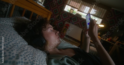 © m-art, Fototapeta premium A young woman with headphones on her head sends text messages on a mobile phone lying on a bed with a depressed look.