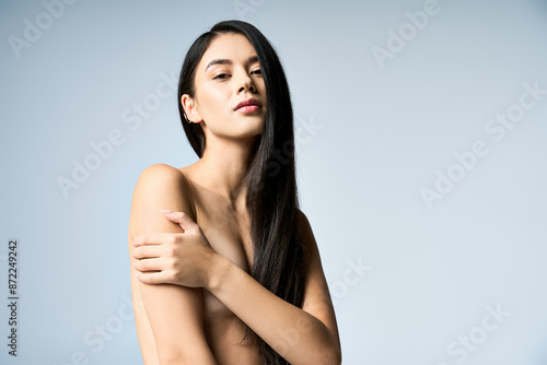 Obraz premium A young woman with long black hair poses confidently in a studio setting.