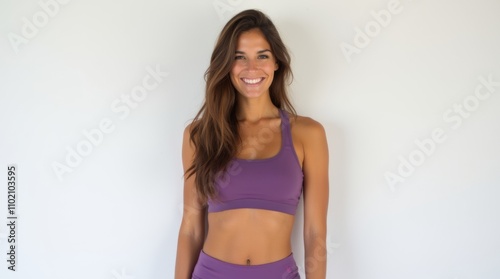 © Kristina, Fototapeta premium 38) A young woman with long brown hair is smiling at the camera. She is wearing a purple sports bra and purple leggings. She is standing against a white wall. She has a toned physique and is