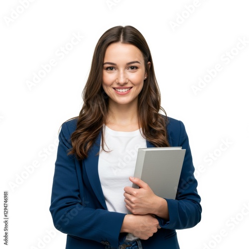 © Alper AI, Fototapeta premium A young woman with long hair, holding a book in front of her, smiling and looking directly at the camera against a plain white background.