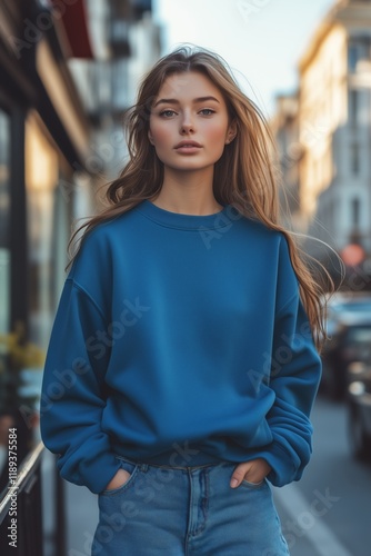 © Aleksander, Fototapeta premium A young woman with long hair wearing a blue color sweatshirt mockup and denim jeans, standing on a city street. The background features blurred buildings and a warm sunset glow.