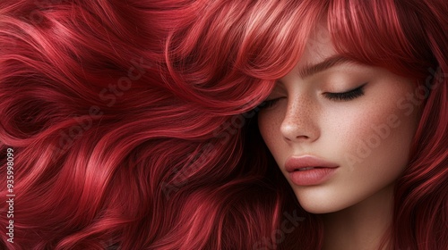 Obraz premium A young woman with luscious, flowing red hair and delicate freckles closes...