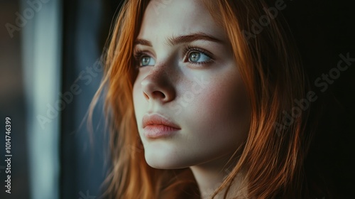 © Zaenal, Fototapeta premium A young woman with red hair and green eyes looks out a window with a contemplative expression.