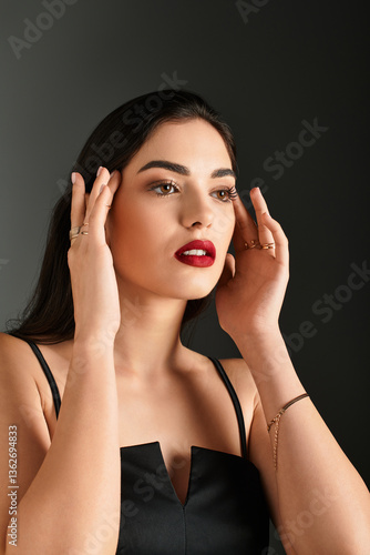 © LIGHTFIELD STUDIOS, Fototapeta premium A young woman with red lips and brown hair against a grey backdrop