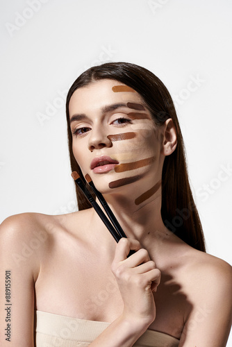 Obraz premium A young woman with various makeup brushes on her face, creating a creative and artistic look with foundation.