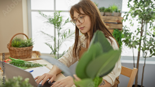 Obraz premium A young woman works on her laptop surrounded by plants in an indoor floral shop setting.
