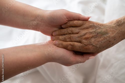 Fototapeta premium A young womans hands gently hold the hands of an elderly female patient in a hospital bed, symbolizing care, support, and compassion.