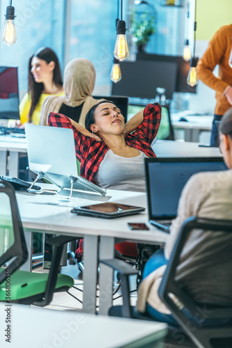 Fototapeta premium A young worker having a break and resting after solving a task while being surrounded by her colleagues. .