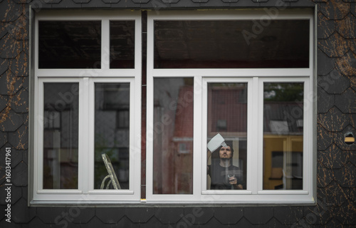 Fototapeta premium A young worker washes windows after construction work.