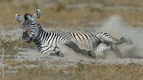 © Akun, Fototapeta premium A young zebra playfully rolls in the dust, kicking up a cloud of sand, its black and white stripes clearly visible against the light-brown earth