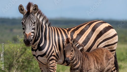 Obraz premium A zebra and her young foal standing together, observing maternal bond in nature