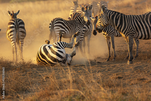 © Grantat, Obraz premium A Zebra (Equus quagga) rolling in dust in the later afternoon sun.