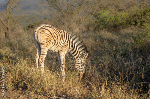 © Shirley and Johan, Fototapeta premium A zebra foal with a big mane grazing in an African game reserve