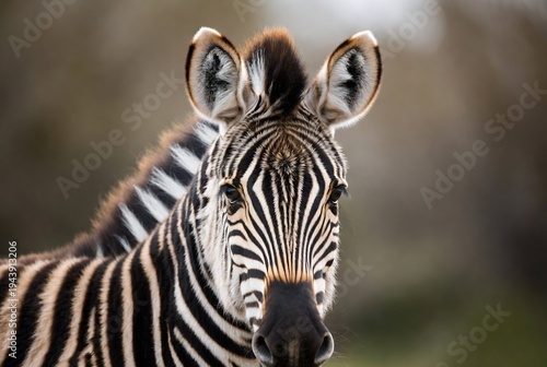 © Anastasiia, Fototapeta premium A zebra gazes directly at the camera with a curious expression.