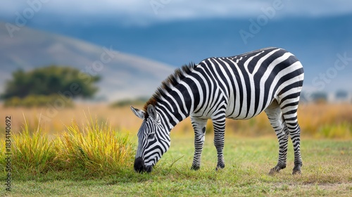 © stardadw007, Fototapeta premium A zebra grazes peacefully in a grassy field, showcasing its distinctive black and white stripes against a blurred background of hills.