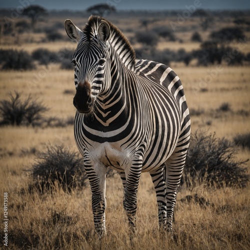 Naklejka premium A zebra grazing in a sunlit savanna, under a dazzling white sky.Majestic and beautiful zebra in the African savannah, wildlife, wild animal. A zebra stands gracefully in a golden grassland, illum