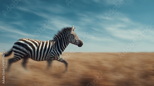 © tope007, Fototapeta premium A zebra is running across a field with a blue sky in the background