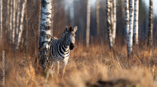 Fototapeta premium A zebra peeks out from behind a birch tree in a serene forest setting,...