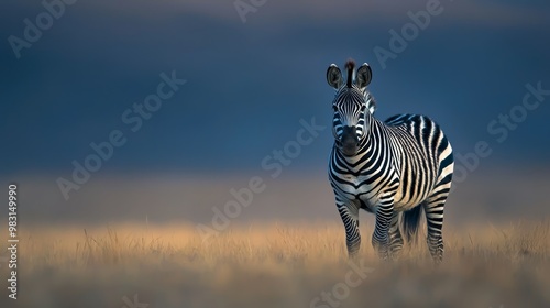 © Wall, Fototapeta premium A zebra stands amidst a dry grass field, darkened by an ominous sky Few clouds scatter the heavens above