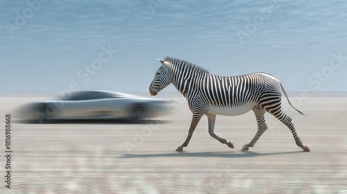 © Olga, Obraz premium A zebra strolls before a hazy vehicle on an arid landscape
