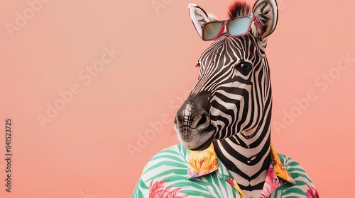 © Galib, Naklejka premium A zebra wearing sunglasses and a hawaiian shirt is standing against a pink background. The zebra is looking to the right of the frame.