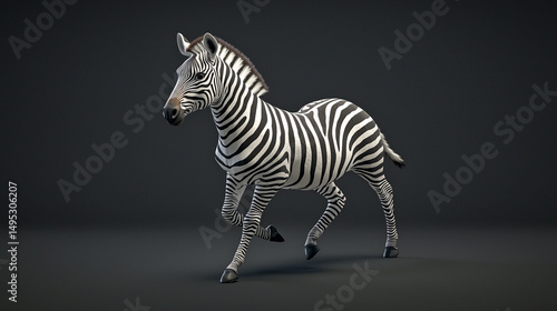© Parol, Fototapeta premium A zebra with black and white stripes running on a black background in a studio setting posed dynamically