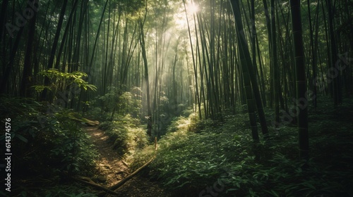 Obraz premium A zen bamboo forest, the towering green stalks creating a calming canopy overhead, with sunlight filtering through . Generative AI