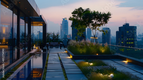 Fototapeta premium A Zen-inspired rooftop garden overlooking the city a peaceful retreat amidst...