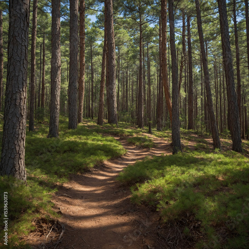 © faisal, Fototapeta premium A zigzag trail moving through a dense pine forest with patches of grass growing along its sides under soft daylight filtered through branches above adding visual rhythm the slightly