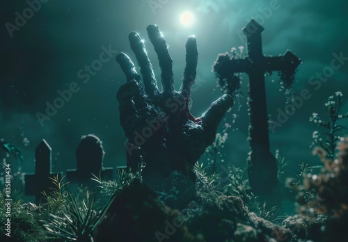 Fototapeta premium A zombie hand is rising from the grave at night with moonlight shining down on it, gothic crosses in the background