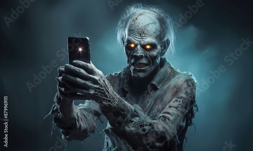 © Julya, Obraz premium A zombie holds a phone in his hand a Halloween concept