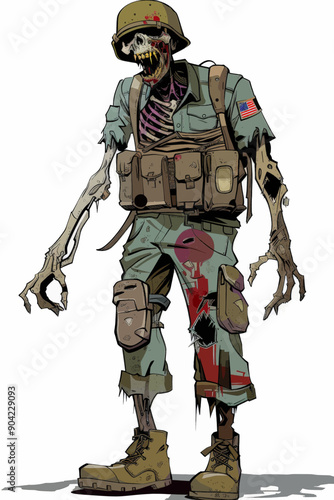 © TheosArtTavern, Fototapeta premium A zombie soldier with a backpack and a US flag on his chest