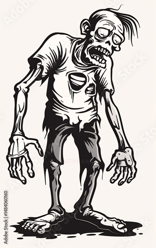 Fototapeta premium A zombie stands upright, mouth open, wearing casual clothing and bare feet,...