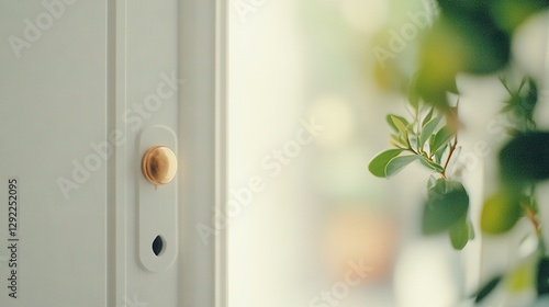 © Igor, Obraz premium A zoomed-in image of a door handle with greenery in front and a window behind it