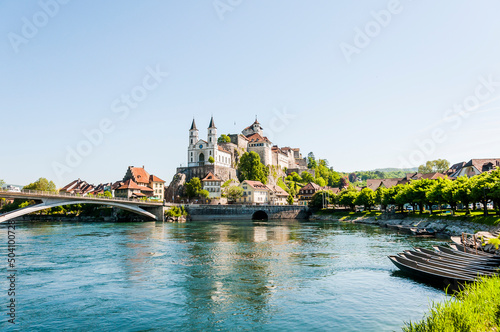Obraz premium Aarburg, Kirche, Festung, Aare, Fluss, Altstadt, Altstadthäuser, Flussufer,...