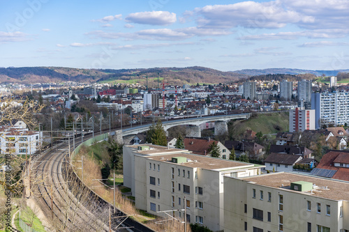 © Claudine, Fototapeta premium Aare Bridge and viaduct with view over Umiken to Brugg . Aerial panoramic view.
