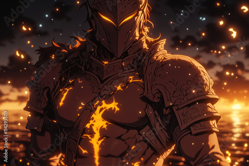© Laurent, Fototapeta premium aasimar cleric in golden armor stands with a backdrop of a fiery sunset