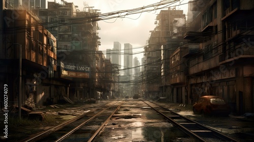 Naklejka premium Abandoned apocalyptic city with tracks created with Generative AI