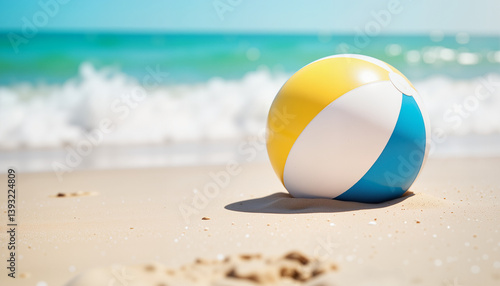 Naklejka premium Abandoned beach ball resting on sand, summer beach vibes