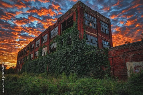 Obraz premium Abandoned brick building, overgrown with ivy, silhouetted against a vibrant...