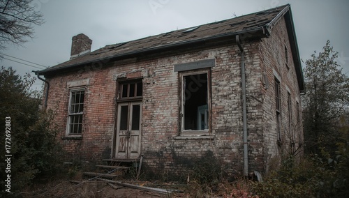 Obraz premium Abandoned brick building with broken windows, urban decay