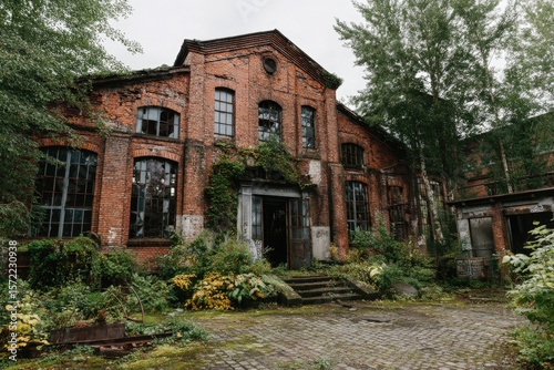 Obraz premium Abandoned brick factory with broken windows and dense overgrown plants in a...