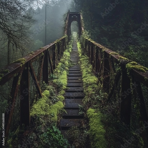 Fototapeta premium Abandoned bridge covered in moss amidst foggy forest in early morning