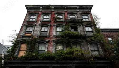 © mahir, Fototapeta premium Abandoned building adorned with overgrown vegetation.