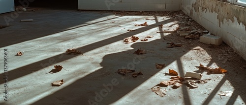 © Ai Studio, Obraz premium Abandoned building interior with fall leaves scattered, dappled sunlight casting geometric shadows, evoking decay and forgotten beauty.