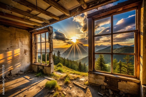 © sanom, Fototapeta premium Abandoned Building Sunbeams Windows Landscape Photography AI Art