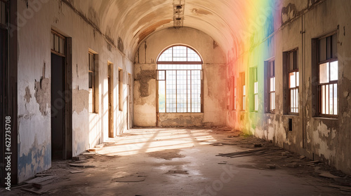 © Ilona, Fototapeta premium abandoned building with rainbow reflection on the walls.