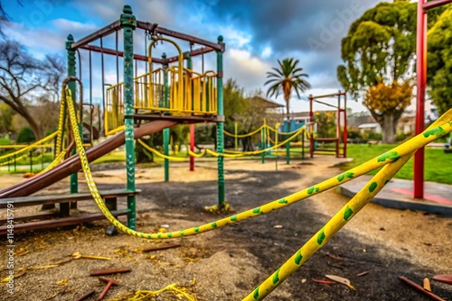 © Adisorn, Fototapeta premium Abandoned California Playground: Covid-19 Closure, Bilingual Caution Tape, Urban Exploration Photo