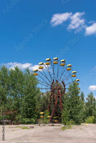 © Serhii Barylo, Fototapeta premium Abandoned carousel and abandoned ferris at an amusement park in the center of the city of Pripyat, the Chernobyl disaster, the exclusion zone, a ghost town